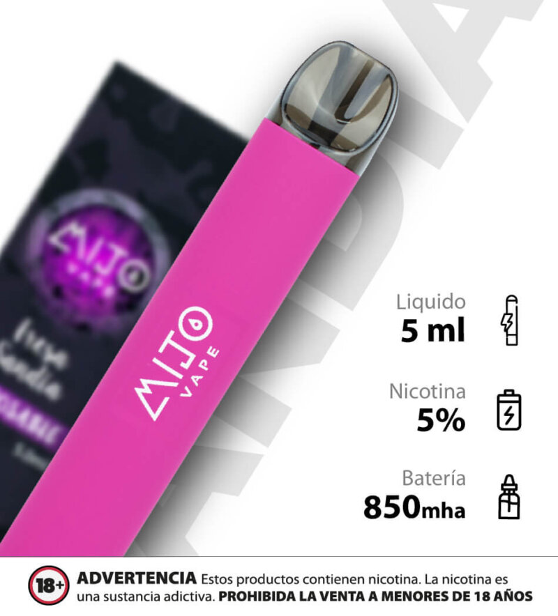 El desechable Mijo Vape, es un vape de 1.500 puff, cuenta con una bateria de 850 mha y 5ml.