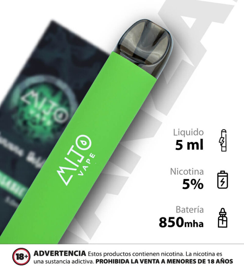 El desechable Mijo Vape, es un vape de 1.500 puff, cuenta con una bateria de 850 mha y 5ml.